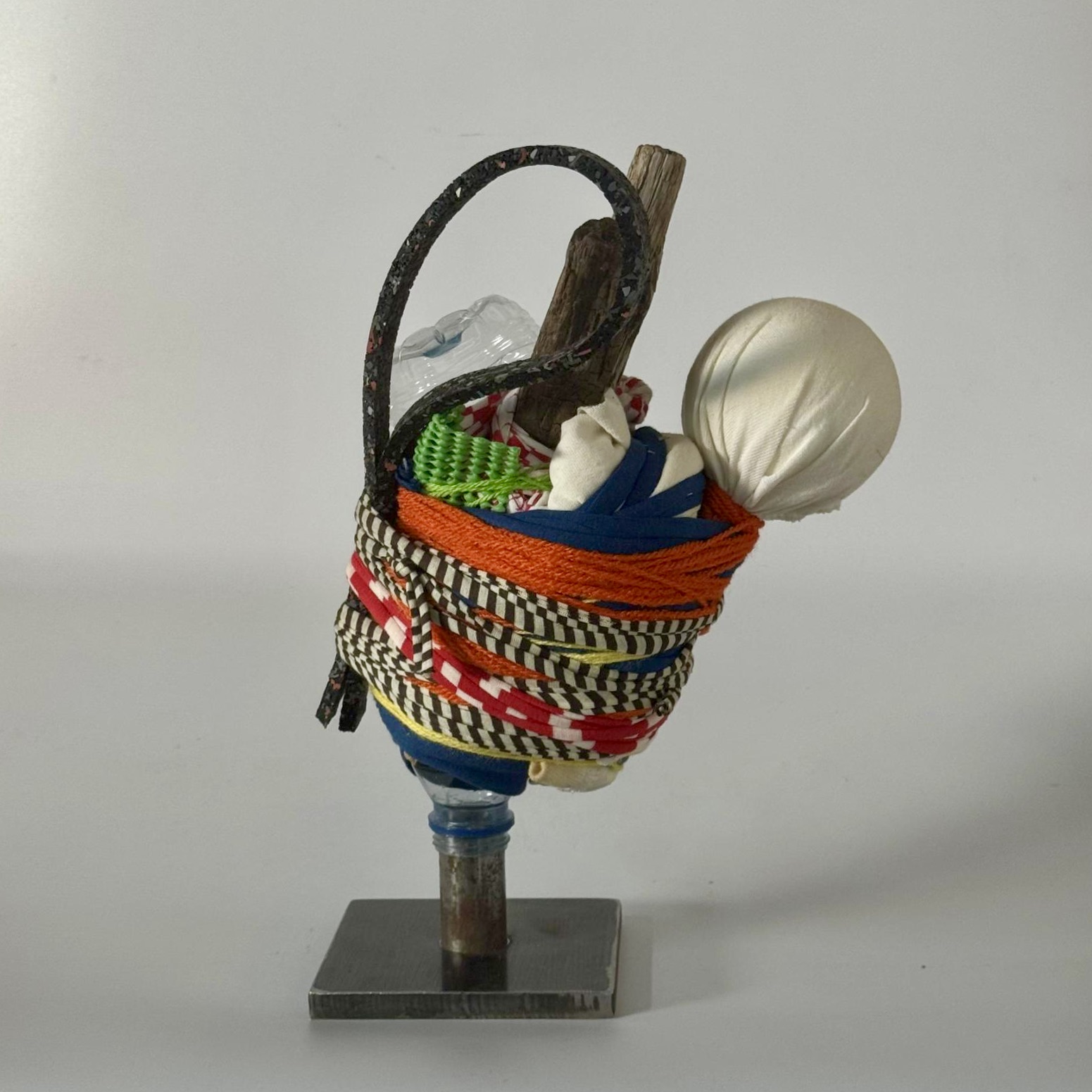 Escultura BB018, 2023.31x22x14 cm.Textiles, madera, plástico y hierro.